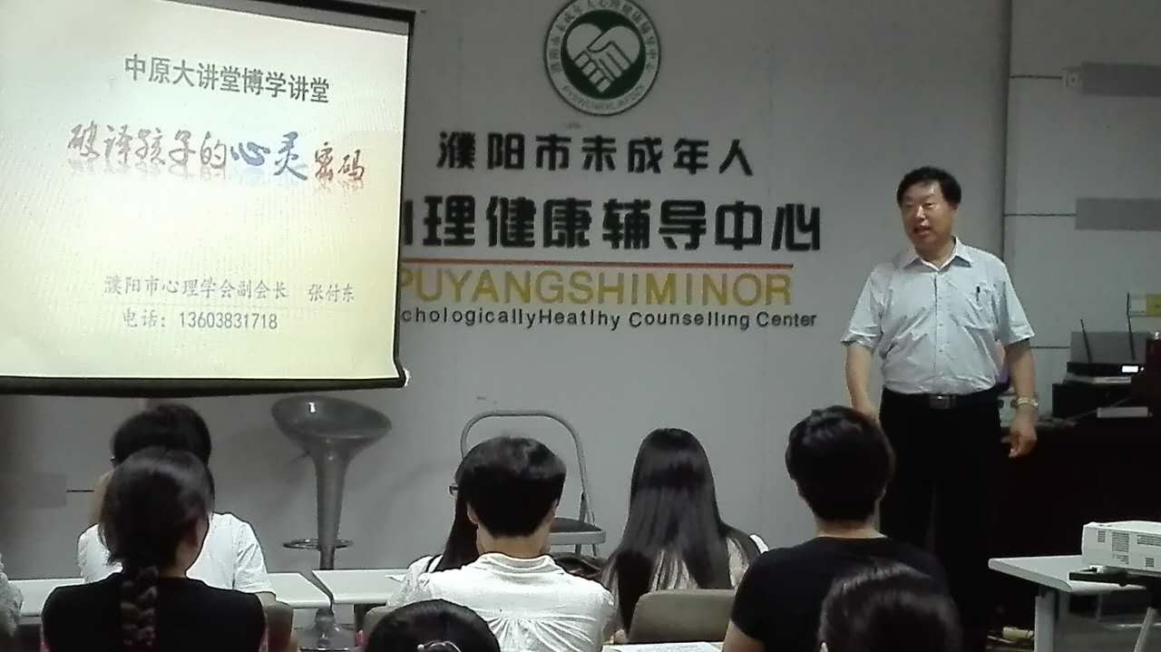 2016年6月8日下午,濮阳市社科联、濮阳市心理学会、濮阳市青少年心理健康辅导中心联合在濮阳市综合活动中心三楼报告厅举行青少年心理专家讲座,邀请国家二级心理咨询师、濮阳市心理学会副会长、讲师团讲师张付东校长为大家做了一场题为《破译孩子的心灵密码》的精彩报告。濮阳市社科联普及部部长李中坤、濮阳市心理学会会长张志峰和来自濮阳市、鹤壁市、中原油田的心理学爱好者、市民群众140多人聆听了讲座。濮阳市心理学会副会长、讲师团团长刘麦岭老师做了总结发言。讲座由濮阳市心理学会讲师团讲师赵望领老师主持。
