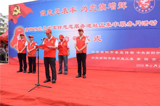 此次活动由南阳市委宣传部、市委组织部、市委市直工委、市文明办联合举办,旨在把践行“两学一做”与弘扬志愿服务精神紧密结合起来,引导和发动更多党员干部积极参与到志愿服务中来。市委宣传部常务副部长景文栓作动员讲话,他要求广大党员志愿者要落实党员志愿者“双注册”和“双对接”,带头进社区开展志愿服务,重点围绕开展好“五个一”社区志愿服务活动,切实为和谐社区作贡献。