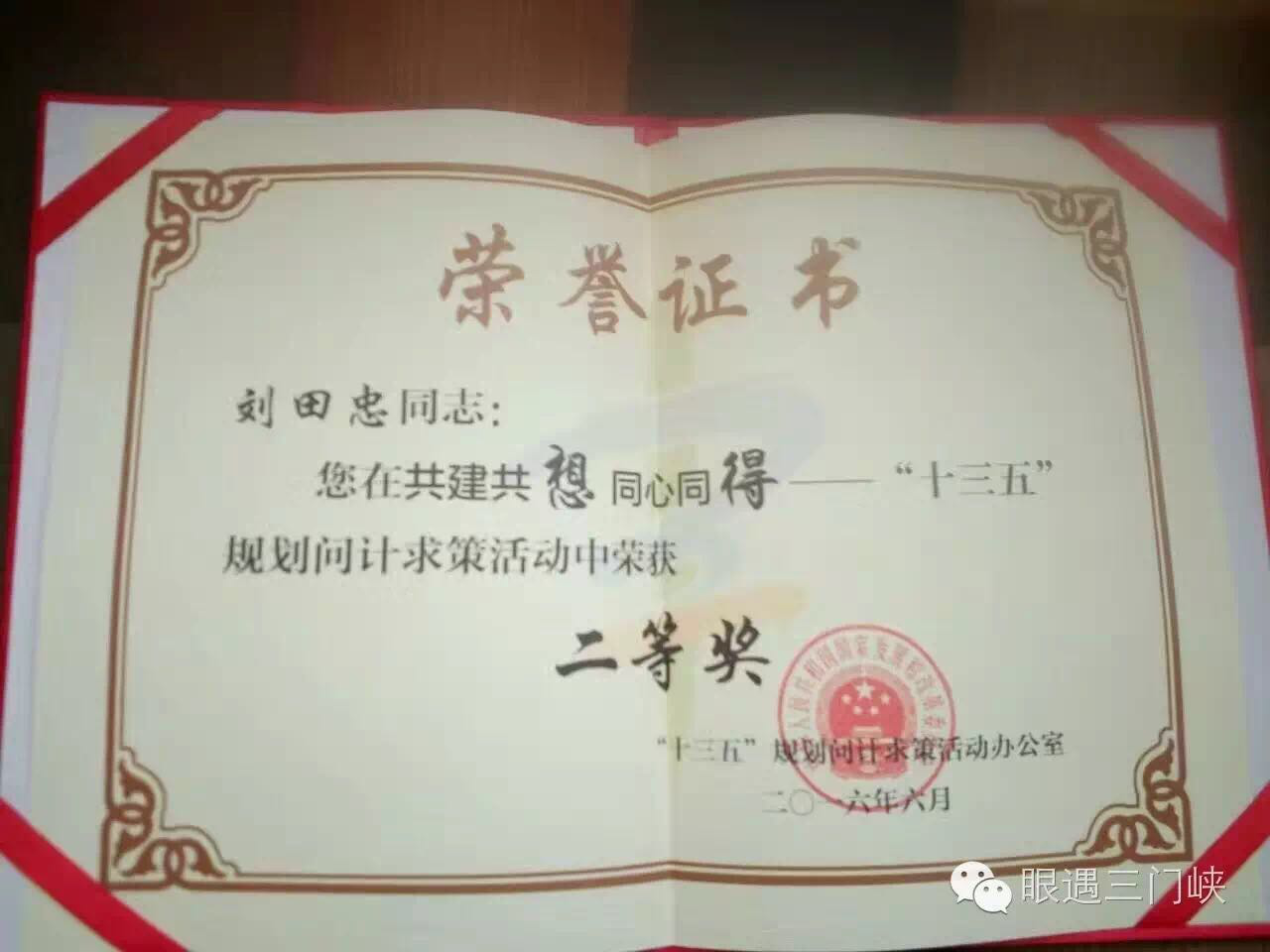 三门峡市青年刘田忠撰写的《美丽乡村建设要做到“五位一体”》获国家“十三五”规划建言献策二等奖。今年是刘田忠三度获奖,2006年、2011年,他曾为国家“十一五”和“十二五”规划积极建言献策,分别获得优秀奖和三等奖。连续三度获得国家级殊荣,在我市乃至全省尚属第一人。