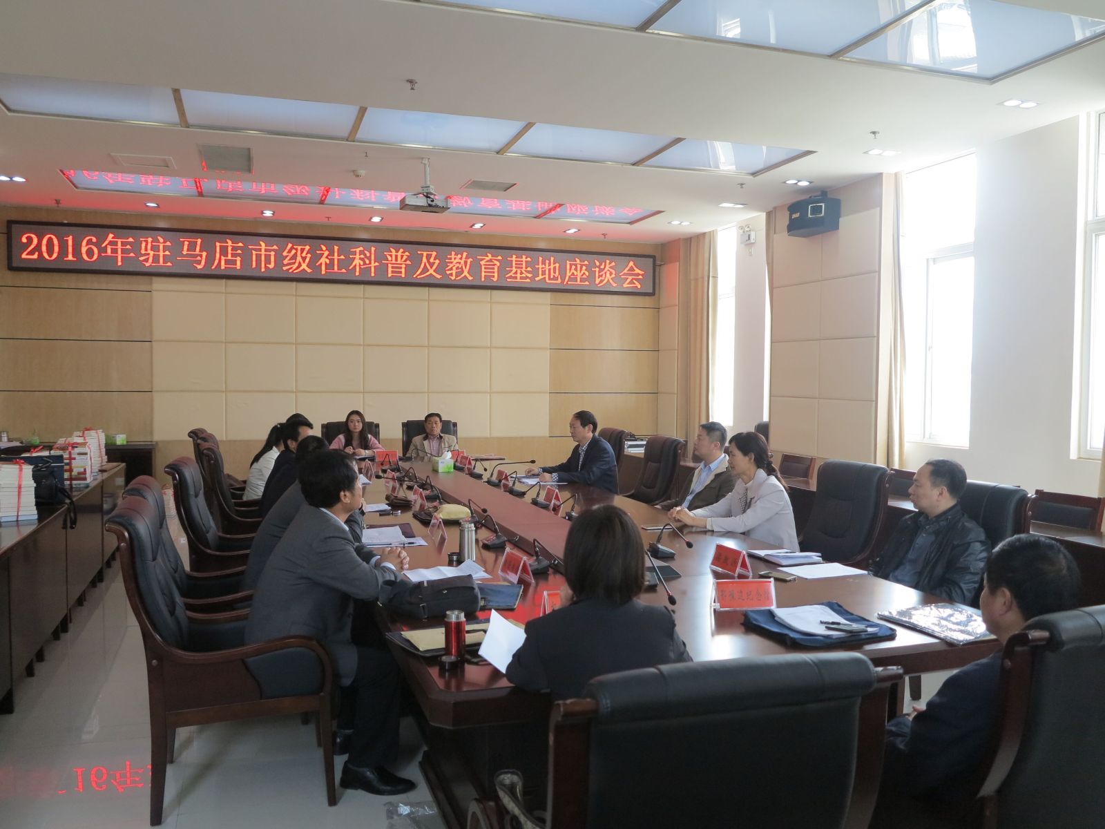 为进一步加强驻马店市级社会科学普及教育基地建设,推动全市社会科学普及教育工作深入开展,4月12日上午,驻马店市社科联召开了2016年市级社科普及教育基地座谈会,省社科联普及处副处长何勇莅临指导,市委宣传部副部长、市社科联党组书记、主席杜萍出席会议,市社科联副调研员栗贯清出席会议并讲话。市级社科普及教育基地负责人和市社科联普及部的同志参加了会议。